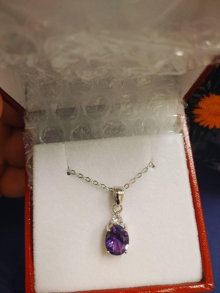 ''Hand made 3-carat eq. (8*10 mm) oval cut lab Alexandrite elongated solitaire pendant necklace, with one diamond simulant on top, white gold or rose gold plated sterling silver setting and chain.''