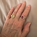 Our ring has the most desired ''Pigeon's blood'' colour which is a deep yet vibrant red, which reflect so much light and fire when being turned. They have the same chemical composition (mineral of corundum), optical appearance and physical characteristics (Mohs scale 9) as top quality rubies, only made in a lab.