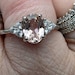 "Hand made 2-carat eq. (6*8 mm) Orangy Pink oval cut lab created Morganite engagement ring, with brilliant cut white diamond simulant 3-stone setting, discreetly adjustable band. "